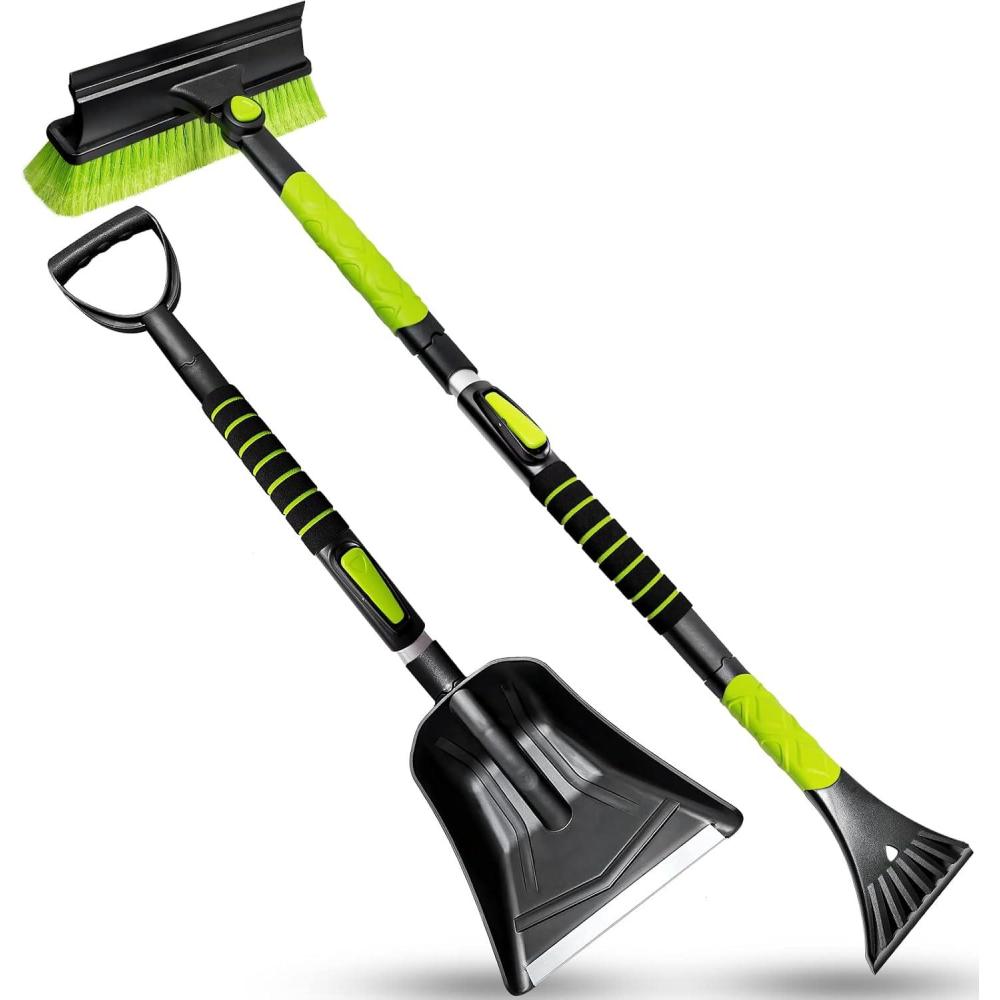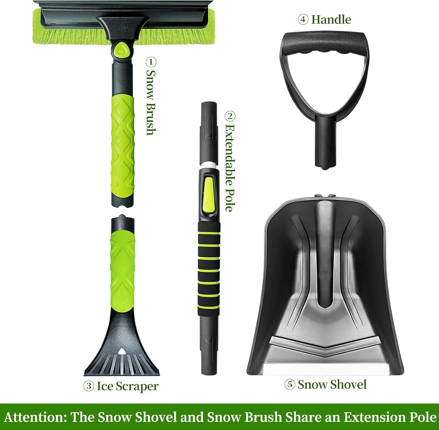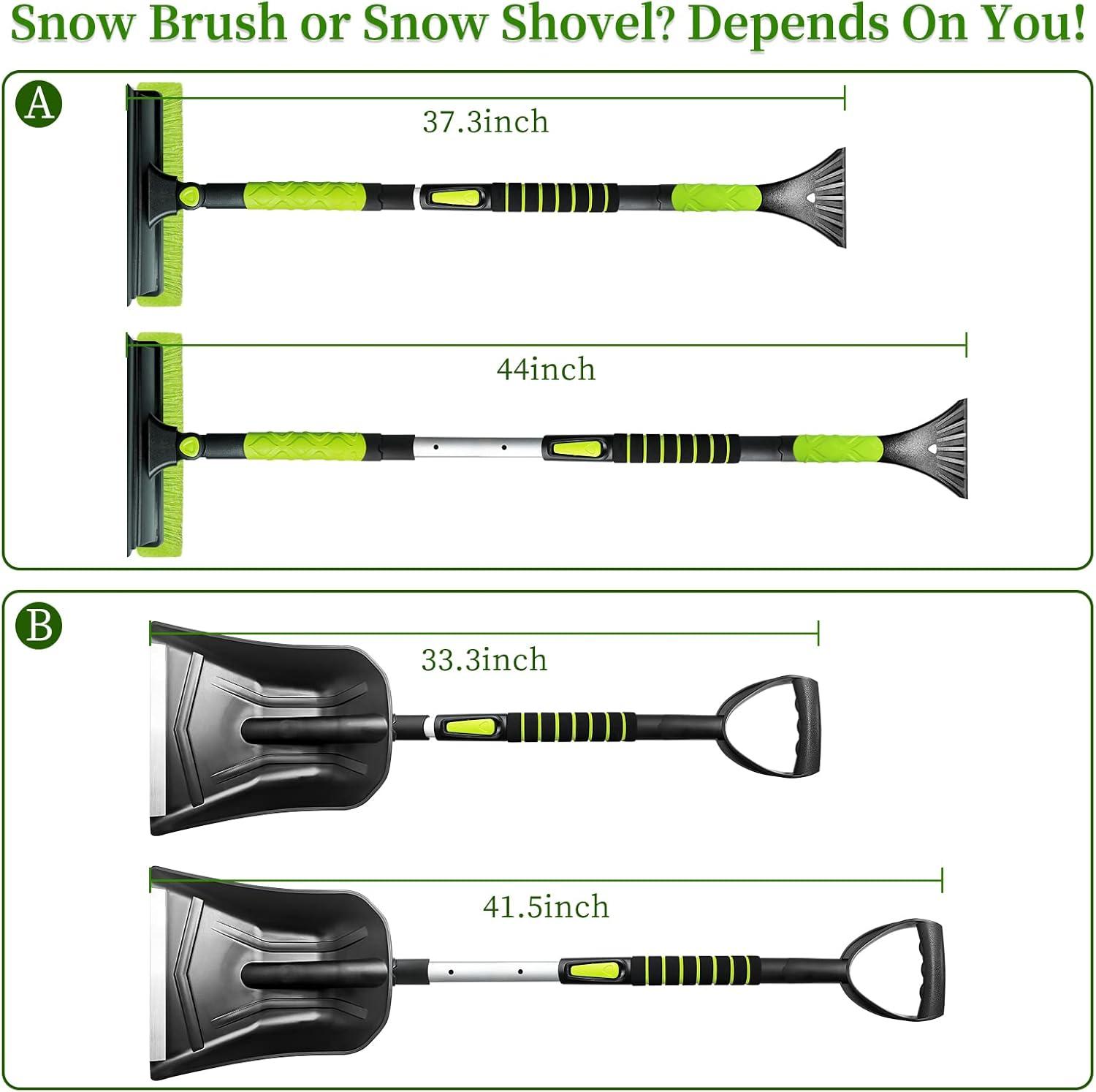 [Extendable Aviation Aluminum Alloy Rod] — The snow brush and shovel share an extension rod. Snow brush can be extended up to 44 inches, easily reach car roof for cleaning heavy snow. The shovel can be extended up to 41.5 inches.